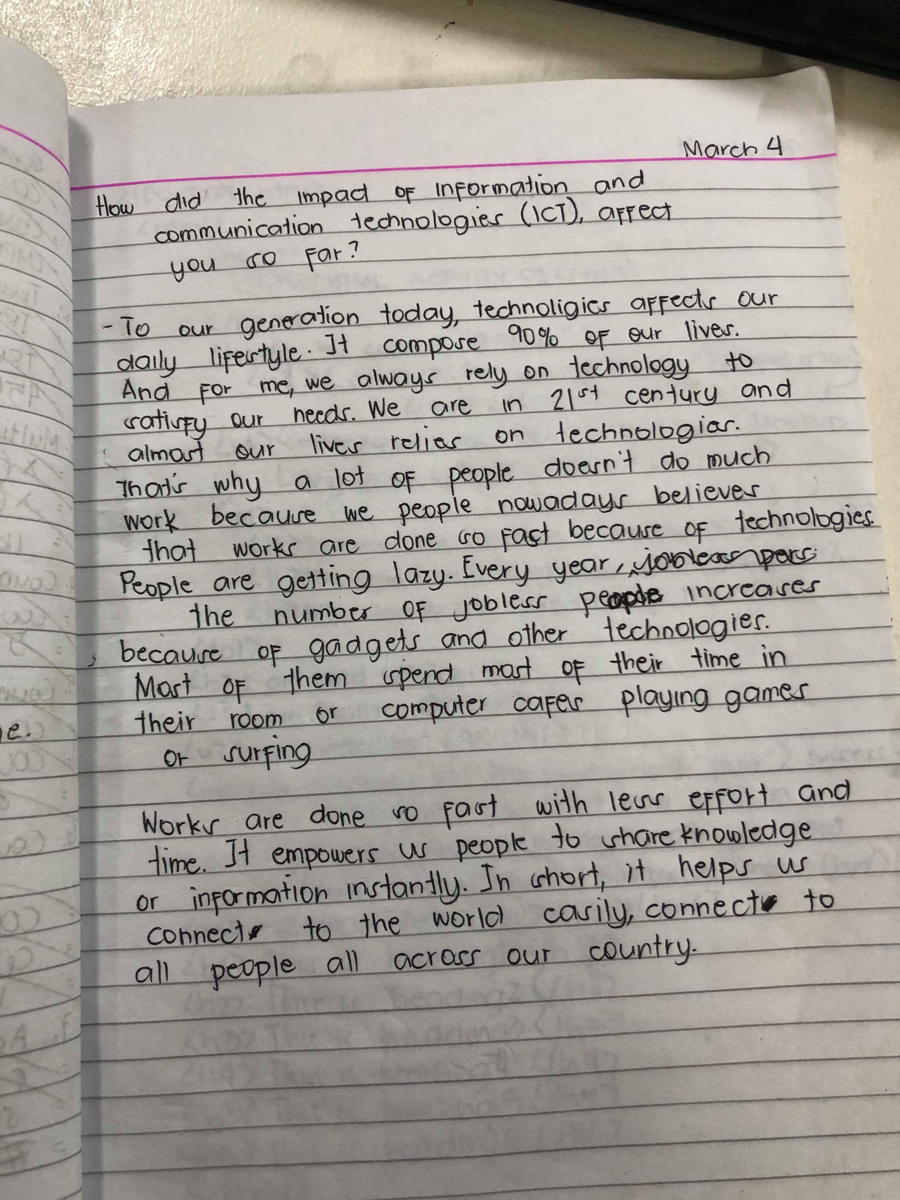 ICT has been a great help for a lot of people, it helped many to because it made a lot of works easier. Many of this so-called technological improvement in our lives have left many of us feeling empty, today we work longer which is fine for the workaholics and the tech-savvy, but for those who can’t cope with all these changes, they will be left out, and that is not a good thing.